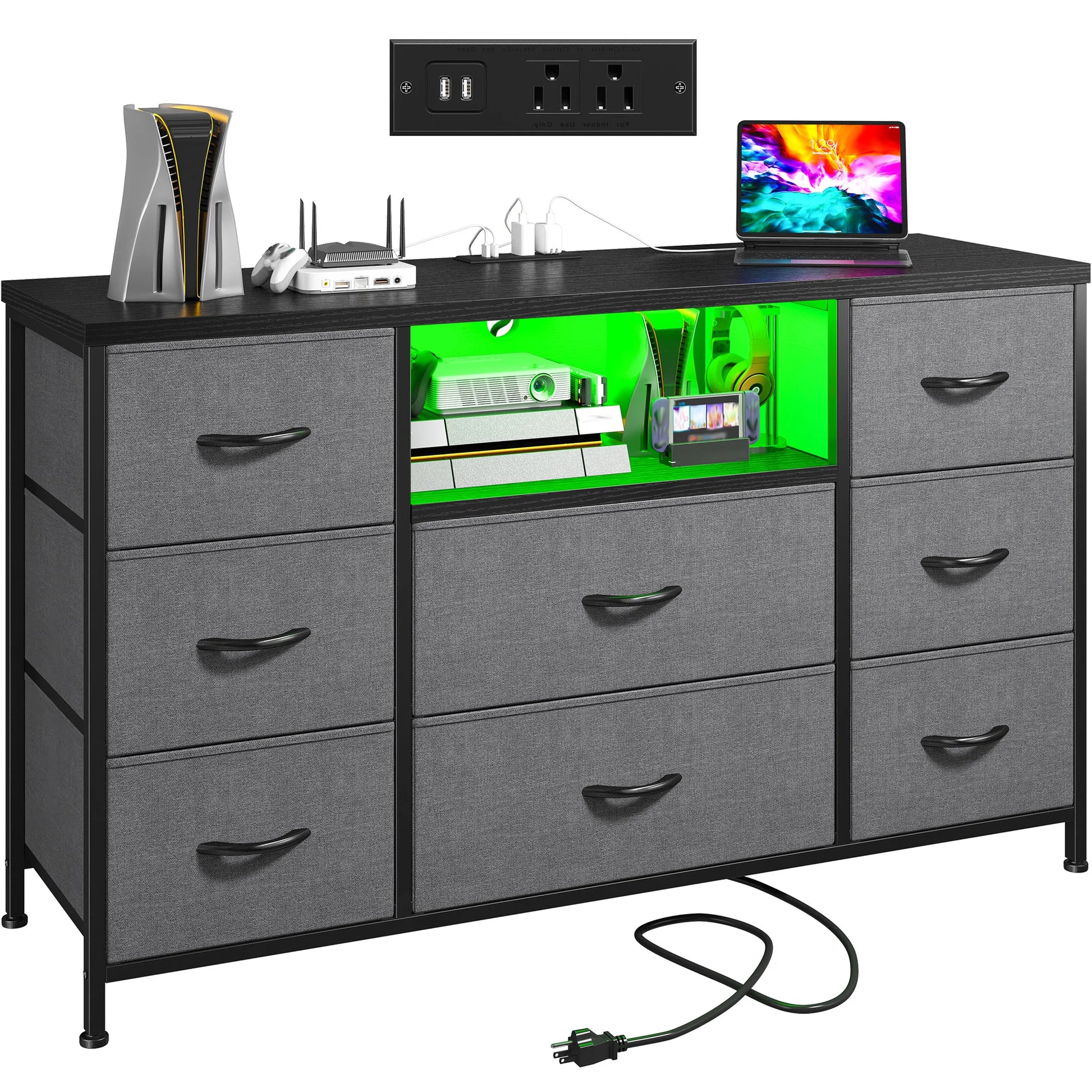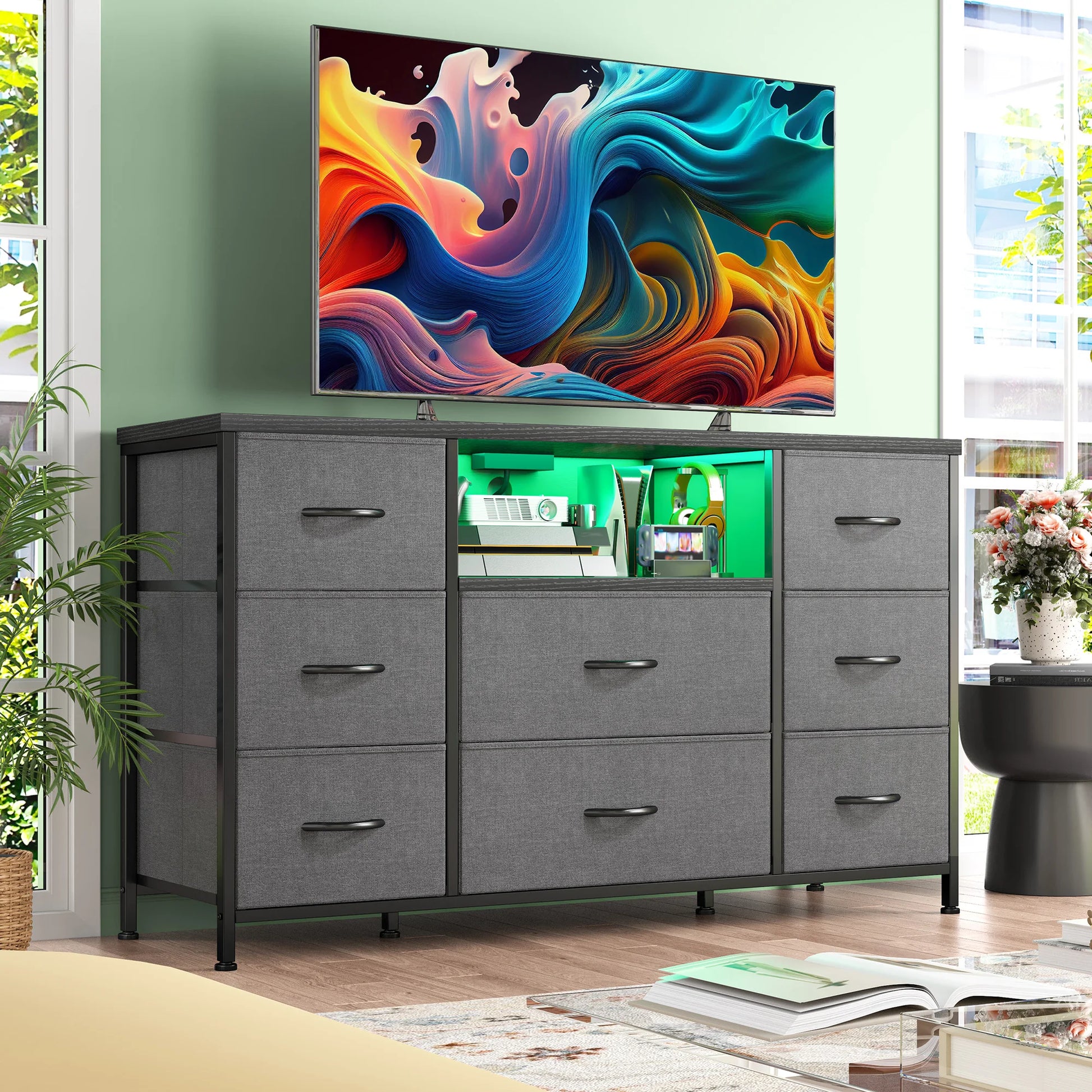 8-Drawer Media Dresser with LED Lighting & Built-in Charging Station - Fabric Storage Cabinet for 55" TVs, Ideal for Bedroom
