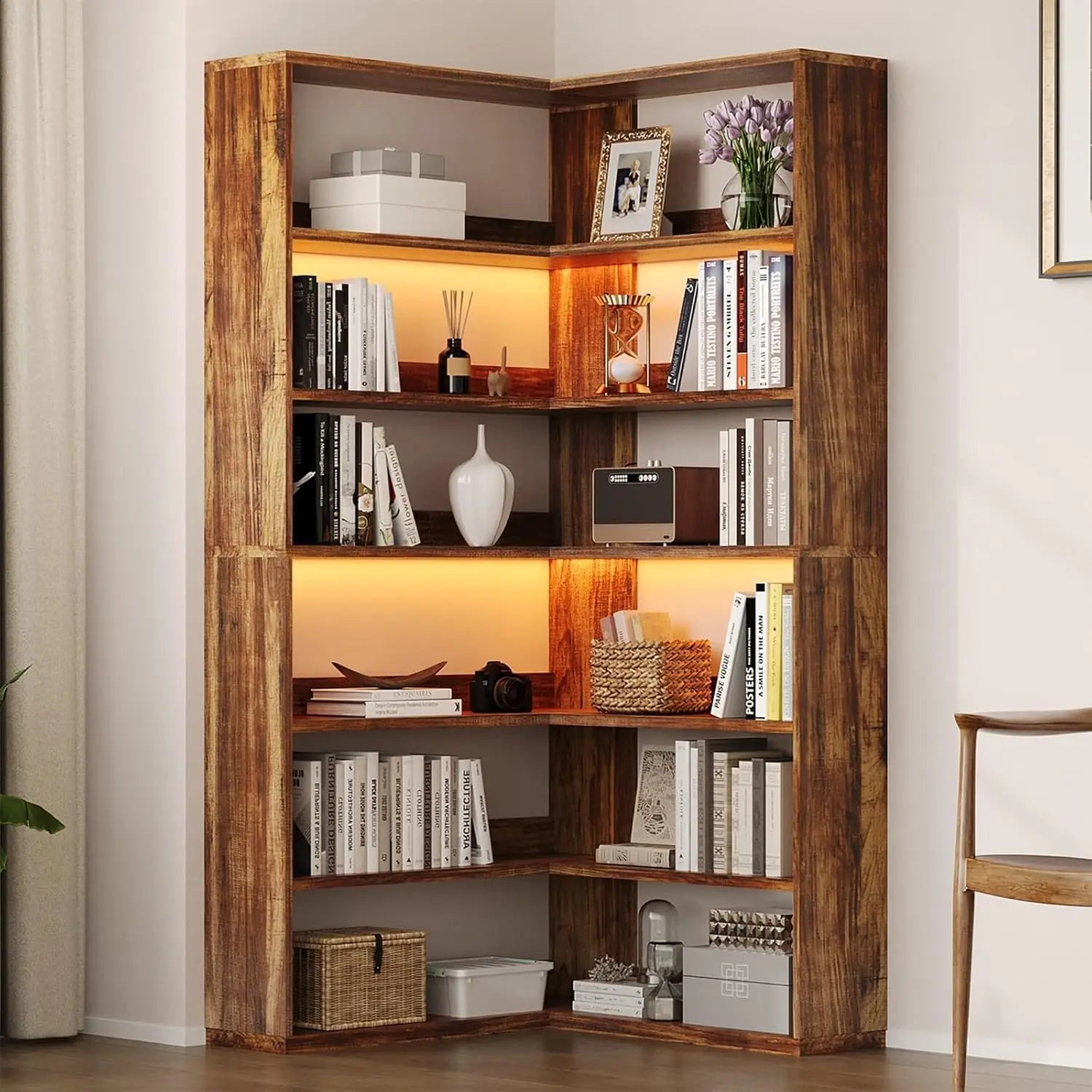 Corner Book Shelf with LED Lights, 71” High Coner Bookshelf with Storage for Living Room, Study Room, Modern, Customized
